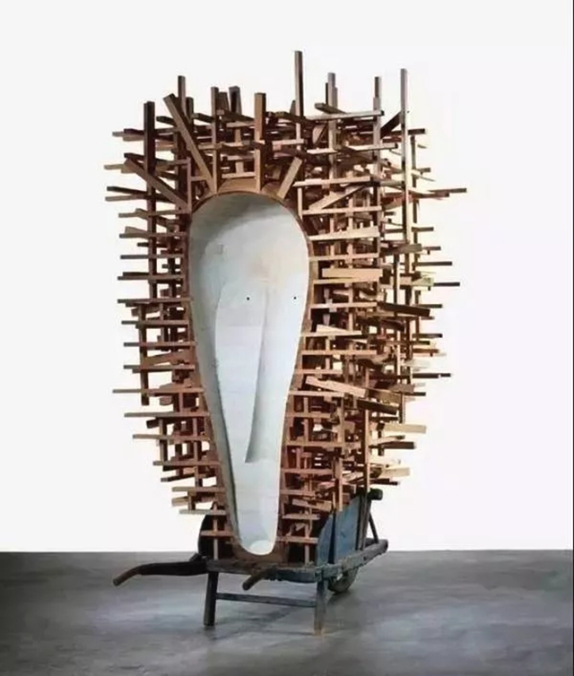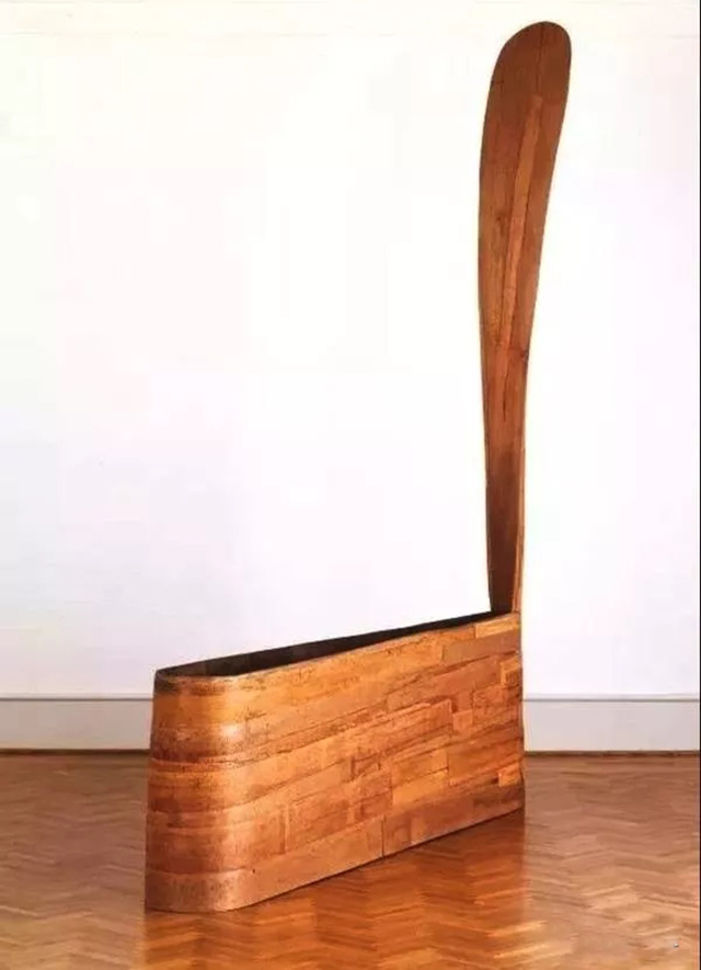 普耶爾首先引起人們注意的一件作品是1985年的鋼木雕塑《魔咒》(The pell)。我們震驚于作品的曲線之美、圓錐的優雅尖細,以及矩形開口的變化多樣;平板木條擁有細細的條紋,其充實的質感讓“木條”看起來像是一個籃子。對編制籃子的影射暗示手工藝和匠人,進而暗示了人的存在。我們可以感受到這件物品是由手工精心制造,我們還能感到普耶爾的藝術背景不僅僅來自非洲,雖然他可能曾在那里見到過手工精湛的器皿和儀式用木器;他的藝術靈感還來源于瑞典,因為他曾在那里學習過木工;此外還有日本,那里具有制作功能性和裝飾性木器的悠久傳統。然而,僅僅由于普耶爾是一名美國黑人,就認定其藝術參照了非洲藝術的說法本身就是個錯誤。他的雕塑與民族身份和政治無關,只是反映出作者在多種文化中的廣泛體驗。通過以木材作為藝術媒介的方式,他得以將這些體驗熟練、完美地表達出來。