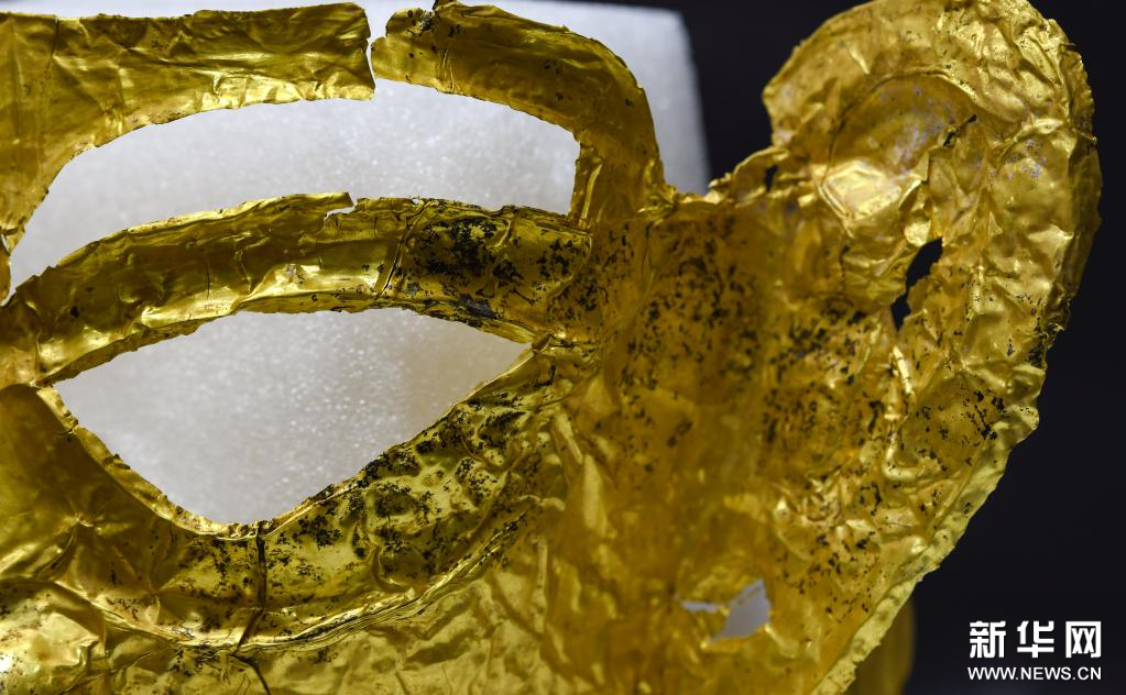 這是在四川省文物考古研究院三星堆考古研究所拍攝的三星堆遺址3號“祭祀坑”出土的金面具